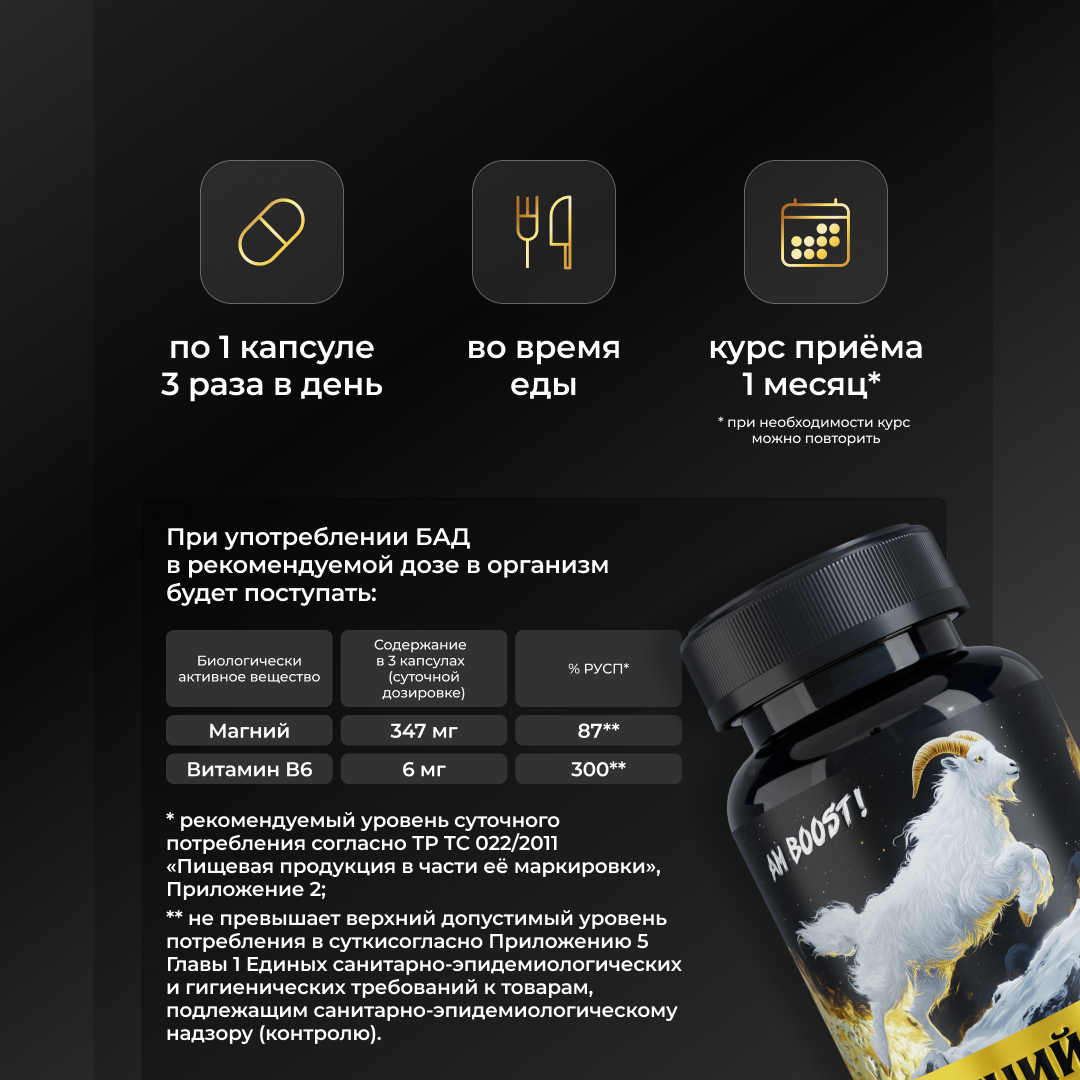 Обрети ловкость и спокойствие Горного Козла! Магний Малат – это сочетание магния с яблочной кислотой, которое поддерживает энергообмен в клетках, помогая чувствовать себя бодрым и активным. Этот вид магния особенно эффективен для снятия мышечного напряжения и борьбы с судорогами, поддерживая здоровье мышц и общее восстановление организма. А входящий в состав витамин B6 поддерживает нервную систему, улучшает когнитивные функции и помогает оставаться сосредоточенным на главном.